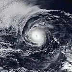 At the time, Fico was the longest-duration hurricane and furthest-traveled hurricane on record in the Central Pacific. It tracked further than any West Pacific typhoon by that point, and only one typhoon – Rita in 1972 – persisted at that intensity longer than Fico. In the Atlantic, only hurricanes Ginger, Carrie, and Faith exceeded Fico with regard to distance traveled or time spent as a hurricane.[8] Fico produced considerable impacts in Hawaii. Southerly flow in association with a cyclone over the Southern Hemisphere combined with east-northeasterly flow from the hurricane, producing beach road flooding along the southeastern shore of the Big Island while Fico was still 500 mi (800 km) away. Ocean waves, breaking at 15–20 ft (4.6–6.1 m) at the coast and larger values offshore, caused severe damage to beachfront homes and roads. Similar waves were observed along the coasts of Oahu and Kauai. A 43 ft (13 m) sloop became stranded in the cyclone's circulation, forcing a Navy torpedo boat to rescue six people on board. A 65 ft (20 m) tugboat was run aground on a reef along the southern shore of Kauai. By July 21, a strong trade wind gradient exacerbated by the presence of Fico caused widespread winds over 60 mph (97 km/h), which resulted in downed trees and power outages. Overall damage in Hawaii totaled $200,000.[9] A week later, the remnants of the storm became intertwined with a strong frontal system, producing heavy rain and winds up to 45 mph (72 km/h) to the Aleutian Islands.[7]