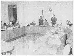 Saddam hurriedly convened an "emergency session" of party leaders on July 22. During the assembly, which he ordered to be videotaped,[3] he claimed to have uncovered a fifth column within the party. Abdul-Hussein "confessed" to be part of a Syrian-financed faction established in 1975 that played a major role in the Syrian-backed plot against the Iraqi government. He also gave the names of 68 alleged co-conspirators.[10] These were removed from the room one by one as their names were called and taken into custody. After the list was read, Saddam congratulated those still seated in the room for their past and future loyalty. Those arrested at the meeting were subsequently tried together and found guilty of treason. Twenty-two men, including five members of the Revolutionary Command Council,[11] were sentenced to execution. Those spared were given weapons and directed to execute their comrades.[12][13]