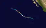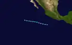 An area of disturbed weather formed south of the Gulf of Tehuantepec on September 7.[3] It organized into a tropical depression around 18:00 UTC on September 8 and intensified into Tropical Storm Guillermo twelve hours later.[5] Flow around the southwest side of upper-level ridging directed the storm to curve northwestward, while the system's track over warm waters allowed it to intensify. It became a hurricane with peak winds of 75 mph (121 km/h) around 18:00 UTC on September 11. Guillermo decelerated over cooler waters south of Baja California,[3] ultimately dissipating after 12:00 UTC on September 13.[5]