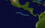 A westward-moving tropical disturbance crossed Costa Rica and Panama into the East Pacific on June 17. The system was slow to organize initially, but developed into a tropical depression by 06:00 UTC on June 21. It further intensified and became Tropical Storm Blanca around 00:00 UTC on June 22. Blanca moved over warm waters and eventually attained peak winds of 50 mph (80 km/h) on June 22–23. The cyclone curved west-northwest and began to weaken, particularly after it encountered colder waters. It dissipated far away from land after 12:00 UTC on June 25.[3]