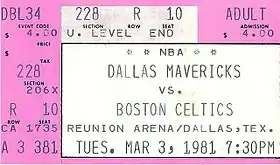 A ticket for a March 1981 game between the Dallas Mavericks and the season's eventual champions Boston Celtics.
