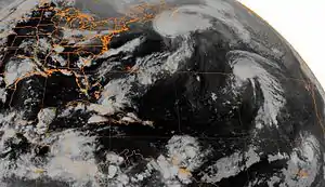 Once again, the storm intensified to near hurricane strength, though Hermine made landfall in Mexico near Coatzacoalcos, Veracruz, on September 24. After moving inland, the storm steadily weakened while tracking south-southwestward toward the Pacific Ocean. However, by early on September 26, Hermine dissipated near the southwestern coast of Mexico.[40] In Mexico, many areas reported at least 10 in (250 mm) of precipitation, while a few locations experienced more than 30 in (760 mm) of rain.[41] As a result of torrential rainfall, at least 30 fatalities occurred, with dozens more missing,[5] and leaving 25,000 homeless.[42] Additionally, landslides triggered by Hermine in Guatemala killed at least eight people.[5]