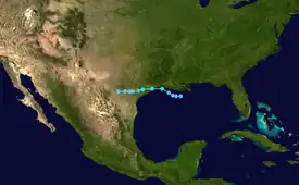 A decaying cold front entered into Gulf of Mexico, and developed a low-pressure area of July 17. Later that day, the low-pressure area developed into Tropical Depression One almost halfway between Louisiana and the Yucatán Peninsula. The depression moved northwestward, and minimal intensification occurred, as it approached the Gulf Coast of the United States. The depression made landfall in Texas near the Galveston area, and dissipated by July 21. Minimal impact was recorded from the depression, and light rainfall was reported in Texas and western Louisiana, peaking at 3.77 in (96 mm) in Refugio, Texas.[16]