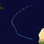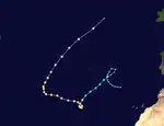After peak intensity, Frances began to weaken and was downgraded to a Category 2 hurricane later on September 9. Following day, the storm fluctuated between Category 2 and Category 1 hurricane strengthen. While curving northwestward on September 13, Frances remained steady in intensity as a Category 2 hurricane. Eventually, Frances re-curved northward, thereby avoiding any land. After minimal change in intensity, Frances weakened to a Category 1 hurricane while tracking northeastward on September 17. After briefly heading northward, the storm re-curved back to the northeast.[38] Early on September 20, Frances weakened to a tropical storm,[39] before merging with a frontal low while centered about halfway between Greenland and Iceland. Several ships reported tropical storm-force winds, but no impacts occurred on land except for minor squalls in Cape Verde.[35]