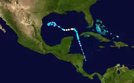 A tropical wave exited the west coast of Africa on September 11 and tracked westward with minimal development until reaching the Caribbean Sea. By September 20, a low-level circulation had developed and the system was then classified as Tropical Depression Eleven, while located almost midway between Panama and Jamaica. While heading almost due westward, the depression steadily intensified, becoming Tropical Storm Hermine on September 21, 18 hours after forming. Later on September 21, the storm passed only 5 mi (10 km) offshore of Honduras. Hermine curved west-northwestward and nearly strengthened into a hurricane before landfall in northern British Honduras (present-day Belize) on September 22. After crossing the Yucatán Peninsula, Hermine emerged into the Bay of Campeche on the following day.[40]