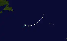 On August 28, a tropical wave emerged into the Atlantic off the west coast of Africa. At 00:00 UTC on September 1, the system developed into Tropical Depression Seven, while centered roughly midway between the Lesser Antilles and the west coast of Africa.[25] Sixteen hours later, the National Hurricane Center initiated advisories on the depression.[26] The depression tracked westward in the trade winds during the following three days, without any intensification. After curving northwestward an Air Force reconnaissance flight found little evidence of a closed circulation, while satellite imagery also showed a disorganized and elongated cloud pattern on September 4.[25] As a result, it was determined that the depression degenerated into a tropical disturbance at 06:00 UTC on that day.[27] However, the National Hurricane Center did not discontinue advisories until 22:00 UTC.[28]