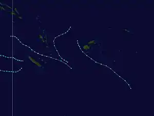 During February 7, Cyclone Harvey moved into the basin from the Australian region as a category 2 tropical cyclone with 10-minute windspeeds of 100 km/h (60 mph).[2][3] During the next day, Harvey gradually weakened as it moved towards the southeast, before at 1800 UTC the JTWC and TCWC Nadi reported that Harvey had weakened below tropical cyclone intensity.[3][4] The subsequent remnant low continued to move towards the south-southeast before it was last noted by the FMS on February 10, while it was located about 270 km (170 mi) to the east of New Caledonia.[2]