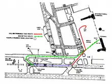 At 1357, the Anchorage ground controller cleared Korean Air Lines Flight 084 to taxi for a departure on either runway 6R or runway 32; the flight crew chose runway 32. The flight crew's selection of runway 32 was contrary to Korean Air Lines' operating specifications, as these required a visibility of at least one-quarter mile for takeoff on runway 32 at Anchorage, while the visibility at the time was only one-eighth of a mile.[1][2][5][lower-alpha 3] (The National Transportation Safety Board [NTSB], which investigated the accident, was unable to determine why the flight crew chose runway 32 instead of runway 6R, in part because the aircraft's cockpit voice recorder (CVR) was never recovered.)[1][2] The proper taxi route from the north apron (where the DC-10 was parked) to runway 32 would have involved taxiing south to the east–west taxiway, then making a right turn onto the east–west taxiway and following it to the threshold of runway 32 before turning right again onto the runway. However, the flight instead taxied southwest on taxiway W-1 to runway 6L/24R and lined up on the latter runway, facing west.[3] The heavy fog prevented the ground controller from being able to see the flight's taxi route[3] and impaired the KAL084 flight crew's ability to navigate around the airport;[2][lower-alpha 4] additionally, some of the lighted taxiway and runway designation signs along the flight's course were partially or fully burned out, making the signs less visually conspicuous and harder to see, and the intersections of taxiway W-1 with the east–west taxiway and with runway 6L/24R lacked signage to indicate the identity of either taxiway (the latter deficiency was rectified after the accident).[1][5] The height above the ground of the DC-10's flight deck, about 30 ft (9.1 m), exacerbated the flight crew's difficulties, as it increased the slant range from the crew's eyes to the runway and taxiway signage and pavement markings.[1][2] After taxiing into position on what the KAL084 flight crew thought was runway 32, the captain expressed some uncertainty that the aircraft was on the correct runway, and briefly considered switching to runway 6R, but, reassured by his first officer's certainty that they were on runway 32, the captain reported at 1403 that Flight 084 was holding in position on runway 32, and, at 1404, the flight was cleared for takeoff. At no time did the flight crew, despite the uncertainty expressed by the captain, attempt to use their instruments to verify that the heading of the runway they were on matched that of runway 32; the NTSB was unable to determine the reason for this omission.[1][2][5]