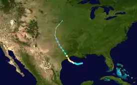 Tropical Storm Barry subsequently turned to the west into an area of increased wind shear and weakened rapidly.[18] It was able to make landfall near Melbourne, Florida, on the morning of August 25 as a 45 mph tropical storm, before weakening to a tropical depression over Florida. After Tropical Depression Barry emerged from central Florida, it was still under pressure from high-level winds. The depression entered the central Gulf of Mexico, and after meandering west for a day or so, returned to tropical storm strength. Just off the coast of Mexico, Barry rapidly intensified into a hurricane on August 28, just before making landfall near Matamoros that afternoon. Before landfall, Barry peaked with 80 mph (130 km/h) winds and a pressure of 986 millibars (29.11 inHg). The remnants quickly dissipated over the Sierra Madre Oriental on August 29.[18]