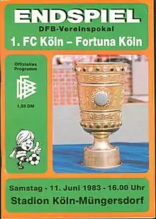 The 1983 DFB-Pokal Final decided the winner of the 1982–83 DFB-Pokal, the 40th season of Germany's knockout football cup competition. It was played on 11 June 1983, and was the first and to date the only cup final between two teams from the same city, which was contested between Cologne clubs 1. FC Köln, playing in the Bundesliga, and Fortuna Köln, playing in the 2. Bundesliga. Fittingy, the match took place in Cologne, at the Müngersdorfer Stadion.[2] 1. FC Köln won the derby match 1–0 to claim their 4th cup title.