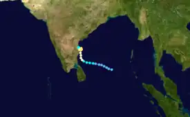 Tropical Cyclone 03B developed as a low-pressure area over the south-central Bay of Bengal on the morning of November 9. The storm intensified into a deep depression in the evening. It followed a west-northwestward path, becoming a tropical storm on November 10 and a cyclone on 11th. By the evening, it had become a severe cyclonic storm. A break in the ridge brought it northward, where steering currents collapsed on 13th. The storm traveled north on the 12th, where a 11–28 km (6.8–17.4 mi)-wide eye was observed via satellite. The storm maintained a mostly stationary position during the 13th. After attaining peak winds of 100 mph (160 km/h), the cyclone looped slowly to the west and crossed Sriharikota in southern Andhra Pradesh on the 14th. It gradually dissipated on the 15th.[2][3]