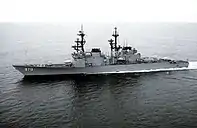 On March 10, 1986, the Ticonderoga-class cruiser USS Yorktown, accompanied by the Spruance-class destroyer USS Caron, entered the Black Sea via the Turkish Straits.[8] Their entrance was observed by a Krivak-class frigate, Ladny, which was ordered to continue observation.[8] On March 13, Yorktown and Caron entered the Soviet territorial waters and sailed west along the southern Crimean Peninsula, approaching within 6 nautical miles (11 km) of the coast.[8] Having entered from the direction of Feodosia, the US warships sailed for two hours and 21 minutes.[8] Both American warships also confronted the Soviet border guard vessels Dozorny and Izmail.[9] The commander of Ladny, Captain Zhuravlev, reported the incident to his superiors.[10]