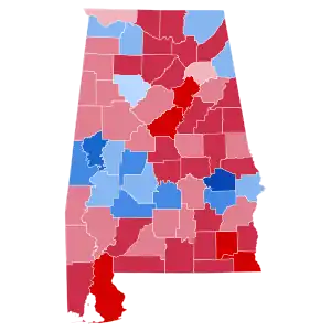 The vast majority of counties in Alabama voted for Bush, with the major exception being the Black Belt, which with its predominantly African-American populace voted overwhelmingly Democratic. Macon County had been the most Democratic in the nation in 1980 and 1984, and it was Dukakis’ sixth-best county in the nation with a margin of over four-to-one for the Massachusetts Governor.[1]