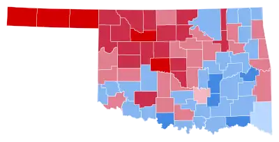 | Okmulgee | 5,674 | 40.52% | 8,262 | 59.00% | 40 | 0.29% | 28 | 0.20% | -2,588 | -18.48% | 14,004 |