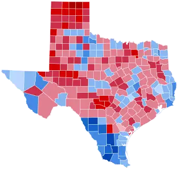 The election was very partisan, with more than 99% of the electorate voting for either the Democratic or Republican parties.[3] Every county save five gave either Bush or Dukakis an outright majority; Bee County gave Bush a plurality, while Hudspeth, Lee, and Polk Counties gave Dukakis a plurality. Houston County gave Bush exactly half of its vote. Bush's best county was Ochiltree, which gave him 83.3% of its vote; Dukakis' was Starr, which gave him 84.7%. Starr was Dukakis' strongest county nationally.[4]