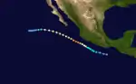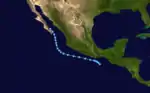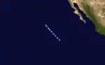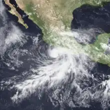 A large area of disturbed weather persisted south of Mexico for several days, perhaps enhanced by a westward-moving tropical wave that departed Africa on June 12. The disturbance organized into a tropical depression around 00:00 UTC on June 27 while located about 115 mi (185 km) south of the Gulf of Tehuantepec. The newly designated cyclone moved generally toward the northwest, passing about 60 mi (97 km) offshore Mexico near Puerto Escondido on its closest approach.[8] Although the depression developed a symmetrical area of convection on June 30,[9] it soon passed over cooler ocean waters and began to become disheveled.[10] The system dissipated a short distance north of La Paz, Baja California Sur, around 00:00 UTC on July 2.[8]