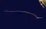 At 18:00 UTC on October 11, the season's final tropical depression formed over the East Pacific and moved northwest.[51] The system was poorly organized, with a circulation elongated west to east, and embedded within an environment of strong wind shear.[52] Thus, it never became a tropical storm and instead dissipated around 00:00 UTC on October 14.[51]