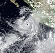 A tropical wave departed Africa on August 24 and reached the East Pacific on September 4, where it began to organize. The system congealed into a tropical depression by 12:00 UTC on September 8 after it developed tightly curled rainbands. It intensified into Tropical Storm Lidia six hours after formation, and it became a hurricane by 06:00 UTC on September 10. The cyclone paralleled the coastline of Mexico on a west-northwest course, and it continued to strengthen as outflow expanded in all directions.[43] In a 24-hour period ending at 06:00 UTC on September 11, Lidia underwent a period of rapid intensification, with its winds increasing from 80 mph (130 km/h) to a peak of 150 mph (240 km/h).[18] Satellite imagery around this time showed a hurricane with a large, well-defined eye surrounded by intense convection.[44] After peak, the cyclone recurved northeast ahead of an upper-level trough, bringing Lidia onshore south-southwest of Culiacan, Sinaloa, with winds of 100 mph (160 km/h) around 08:00 UTC on September 13. The system dissipated over central Texas on September 14 as it merged with a cold front.[45]