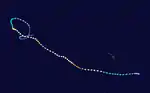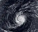 On August 30, a tropical disturbance developed south of Panama. Around 12:00 UTC on September 5, the system organized into a tropical depression as thunderstorms coalesced into loosely defined rainbands. These bands increased in intensity over subsequent hours, signaling the cyclone's intensification into Tropical Storm Kenneth by 06:00 UTC on September 6. Over the coming days, the cyclone moved on a sinussoidal-like path across the East Pacific, alternating between west and west-northwest. On September 8, Kenneth attained hurricane strength, which was followed by its development into a major hurricane on September 10, shortly after an eye first appeared on satellite. Early the following day, it became a powerful Category 4 cyclone with peak winds of 150 mph (240 km/h).[40] Kenneth displayed a small but well-defined eye embedded within a very cold central dense overcast at this time.[41] Soon, the cyclone encountered cooler waters and southwesterly wind shear on its northwest trek,[42] which caused the system to decay. Kenneth dissipated at 00:00 UTC on September 18, though its remnant circulation persisted for a few more days.[40]