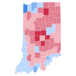As of the 2020 presidential election, this is the last election in which the counties of Blackford, Clark, Crawford, Floyd, Gibson, Jefferson, Knox, Pike, Posey, Sullivan, Switzerland, and Warrick voted for the Democratic presidential nominee.[3] This is also the last presidential election in which Hamilton County was the most Republican county in Indiana. This was the first election where a Democrat served two terms and never carried Indiana.