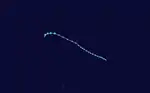 A building anticyclone to its northwest forced the depression southeastward. It became steadily less organized, and on July 26 JTWC issued a final warning on the system, believing it to be dissipating. Shortly thereafter, however, the system began re-organizing, and on July 27 the system developed into Tropical Storm Scott. The storm tracked northwestward, then westward, and finally turned to the northeast. Scott gradually strengthened to attain peak winds of 105 km/h (65 mph) on July 29.[24] JMA had upgraded the depression to tropical storm status on July 28, and assessed its peak intensity at 75 km/h (47 mph).[7] Scott maintained its peak intensity for about 12 hours before slowly weakening as it accelerated northeastward. On August 2, the storm merged with an approaching frontal trough,[24] and the following day JMA considered Scott dissipated while located near the Alaskan island of Gareloi.[7] Tropical Storm Scott never affected land.[24] The storm was the only tropical cyclone during the season to not form from the monsoon trough.[25]
