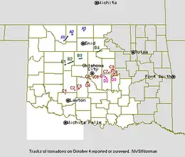 F1 S of Dover Kingfisher OK 35°55′N 98°00′W / 35.92°N 98.00°W / 35.92; -98.00 (Dover (Oct. 4, F1)) 22:28-22:42 7 mi (11 km) 100 yd (91 m) A haybarn was destroyed, five barns were damaged, and one home was also damaged. Powerlines and trees were downed along the path.[12]