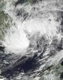 As 01W intensified over the Philippine Sea,[2] a broad area of low pressure developed in the South China Sea. The low slowly intensified as it moved towards the north-northeast and was declared Tropical Depression 02W early on July 8. Tropical Depression 02W slowly strengthened as northerly outflow was constricted. By late on July 8, the depression was upgraded to a tropical storm and given the name Nichole. The storm reached its peak intensity while just offshore southern Taiwan with winds of 95 km/h (60 mph 1-minute winds) according to the Joint Typhoon Warning Center (JTWC)[2] and 65 km/h (40 mph 10-minute winds) with a minimum pressure of 998 hPa (mbar) according to the Japan Meteorological Agency (JMA).[4] The combination of dry air, strong wind shear, and the storm's proximity to land caused Nichole to quickly weaken to a tropical depression twelve hours after reaching its peak intensity. The exposed remnants of Nichole executed a clockwise-loop offshore Taiwan before traveling north into mainland China and dissipating.[2] Rough seas produced by the storm caused four container ships to run aground in Taiwans' Kaohsiung Harbor, none of the crew members were injured. Heavy rains in Taiwan flooded an estimated 2,500 acres (10 km2) of crops.[5]