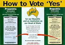 The Australian republic referendum held on 6 November 1999 was a two-question referendum to amend the Constitution of Australia. The first question asked whether Australia should become a republic, with a President appointed by Parliament following a bi-partisan appointment model which had been approved by a half-elected, half-appointed Constitutional Convention held in Canberra in February 1998. The second question, generally deemed to be far less important politically, asked whether Australia should alter the Constitution to insert a preamble.[3] Since the early 1990s opinion polls had suggested that a majority of the electorate favoured a republic.[4] Nonetheless, the republic referendum was defeated.