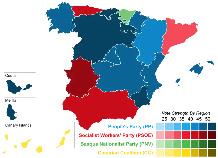 The ruling People's Party (PP)—which for the first time contested a nationwide election in Spain while in government—emerged as the largest political force in the country, albeit with a diminished victory margin than in the previous election held in 1994. The Spanish Socialist Workers' Party (PSOE), in opposition for the first time since 1982, recovered some ground from its previous result. Overall, the PP lead decreased from 9.3 to 4.4 percentage points, though this was an increase from the 1.2 points between both parties in the 1996 general election. United Left (IU) lost half of its votes and parliamentary representation amid internal divisions—Initiative for Catalonia (IC) and the New Left (NI) had split from the larger alliance in 1997—policy differences over their relationship with the PSOE and the deteriorating health condition of IU's maverick leader, Julio Anguita.
