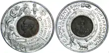 Beginning with the proclamation of the Kingdom of Italy, no official tests of the 1-cent lira coin were ever minted; however, an exception was a design drawn up during the regency of Victor Emmanuel III. In 1917 World War I was eroding the kingdom's copper reserves, so to avoid using this metal in the minting of cents the mint thought of replacing copper with aluminum. Using the official coinage, a few aluminum cent coins weighing 0.35 g were thus issued, but the imminent end of the war put a definitive end to the project.[52][53] In addition to the aluminum cent, a number of one-cent coins were minted annually from 1915 to 1918 during World War I, bearing on the right side, arranged in two lines and engraved in relief, the inscription i, ii, iii and iv anno di gverra.[53]