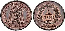 The 1 lira cent (Italian: centesimo di lira), commonly called centesimino,[1] was the smallest denomination of Italian lira coins. Like the contemporary 2, 5 and 10 cent coins, it was made of a bronze alloy composed of 960‰ copper and 40‰ tin.[2] The 1-cent coins were minted between 1861 and 1918, only to be withdrawn from circulation in 1924.[3]