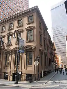 The site was historically part of New Amsterdam, a 17th-century Dutch colonial settlement in modern-day Lower Manhattan; the building's site was acquired by Richard Smith in the 1640s.[7] By the next decade, the southern portion of the lot was sold to Evert Duyckingh (also "Duyckinck"), who developed a house on the site.[8] The northern portion was given to Abraham Martens Clock, who also developed a house on his site; after 1673, town official Nicholas Bayard bought the western end of Clock's land and built a house there.[9] There were numerous buildings on the site by 1812, occupied by various dwellings and businesses.[4] These structures were all destroyed in the Great Fire of 1835, which leveled a large portion of the neighborhood.[10]