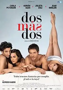 2+2 (Spanish: Dos más dos) is a 2012 Argentine comedy-drama film directed by Diego Kaplan and starring Adrián Suar, Carla Peterson, Julieta Díaz and Juan Minujín.[2] The plot revolves around two successful friendly couples: Diego and Emilia, and Betina and Richard. One night, Richard and Betina reveal to Diego and Emilia that they are swingers and would like to swap partners with them, tempting Emilia.