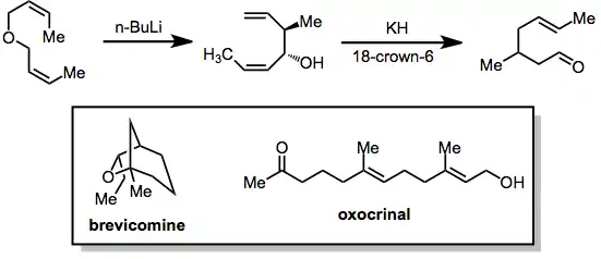 The products of the [2,3]-Wittig rearrangement of bis(allylic) ethers are 1,5-dien-3-ols. These substrates may undergo the oxy-Cope rearrangement upon deprotonation, affording δ,ε-unsaturated carbonyls. This tandem sigmatropic strategy has been employed in the synthesis of some natural products, including brevicomine and oxocrinol.[16]