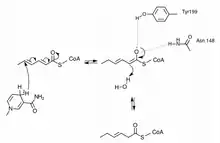 - ↑ Fillgrove KL, Anderson VE (October 2001). "The mechanism of dienoyl-CoA reduction by 2,4-dienoyl-CoA reductase is stepwise: observation of a dienolate intermediate". Biochemistry. 40 (41): 12412–12421. doi:10.1021/bi0111606. PMID 11591162.