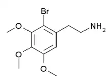 2-Bromomescaline (2-Br-M) is a derivative of the phenethylamine hallucinogen mescaline which has an unusual 2-bromo substitution.[1][2] It is an agonist for serotonin receptors, with a binding affinity of 215 nM at 5-HT1A, 513 nM at 5-HT2A and 379 nM at 5-HT2C, so while it is around ten times more tightly binding than mescaline at 5-HT1A and 5-HT2A receptors, it is over twenty times more potent at 5-HT2C.[3]