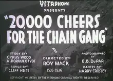 20,000 Cheers for the Chain Gang is an extant musical comedy film released in 1933. It was directed by Roy Mack.[1] The 20-minute film is about escaped prisoners trying to break back into a jail where condition have improved dramatically. The film was written by A. Dorian Otvos and Cyrus Wood. It is a spoof of the 1932 film I Am a Fugitive from a Chain Gang.[2][3] and 20,000 Years in Sing Sing. It is a Vitaphone film.[4]