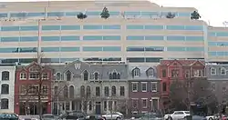 Battles to preserve the row of houses began in October 1976, when the developer who owned several of them began demolishing the house at 2022 I St.[6] Don't Tear It Down (forerunner to the DC Preservation League),[9] a group of historical preservationists organized in 1971 to save the Old Post Office building from destruction,[10] convinced a judge to order a temporary restraining order stopping destruction, as a request to declare the entire block a historic landmark was pending at the time.[6] The developer then attempted, in November, to demolish the house at 2030 I St.; this structure was already listed on the National Register of Historic Places, however, and the state historic preservation officer invoked a delay of 180 days.[6] Discussions with the community did not even begin until the 179th day, and a thirty-day extension to the stay was granted.[6] When this expired, the developer began demolition of the house; preservationists managed to get a restraining order in time to preserve the front half of the structure.[6] Citing the requirement for "meaningful discussion" as laid out in a previous historic preservation case, Don't Tear It Down argued that they had not been able to adequately present their case; while the presiding judge stated that "meaningful discussion" was "beyond the court’s comprehension", he nevertheless issued an injunction preventing further demolition before the case could be heard by the DC Court of Appeals.[6] In the event, historic preservation legislation was passed in 1978 before final adjudication, saving the buildings from destruction.[6] The current design of the property is the result of discussions with local preservation groups.[2]