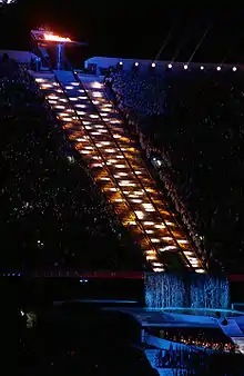 The opening ceremony of the 2000 Summer Olympics took place on the evening of Friday, 15 September 2000 in Stadium Australia, Sydney, during which the Games were formally opened by then-Governor-General Sir William Deane.[1][3][2][4] As mandated by the Olympic Charter, the proceedings combined the formal and ceremonial opening of this international sporting event, including welcoming speeches, hoisting of the flags and the parade of athletes, with an artistic spectacle to showcase the host nation's culture and history. Veteran ceremonies director Ric Birch was the Director of Ceremonies[5] while David Atkins was the Artistic Director and Producer.[6] Its artistic section highlighted several aspects of Australian culture and history, showing Australia's flora and fauna, technology, multiculturalism, and the hopeful moment of reconciliation towards Aboriginal Australians.[5][7] The ceremony had a cast of 12,687 performers,[8] seen by a stadium audience of around 110,000.[7]