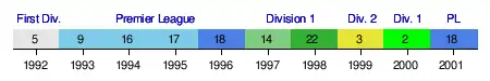 Prior to this season, the history of Manchester City's performance in the English football league hierarchy since the creation of the Premier League in 1992 is summarised by the following timeline chart – which commences with the last season (1991–92) of the old Football League First Division (from which the Premier League was formed).