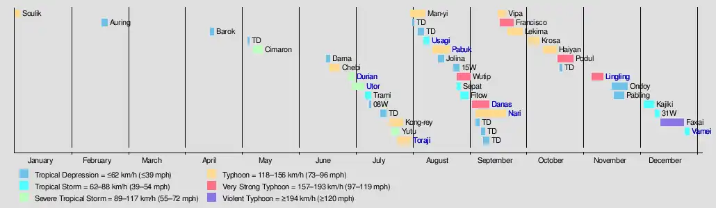 2001 opened with Tropical Storm Soulik, from the previous season, active in the Philippine Sea. Soulik strengthened into the first typhoon seen this year and reached its peak intensity as a Category 3-equivalent typhoon on January 3, before quickly dissipating the next day.[8] The formation of Tropical Depression 01W (Auring), however, officially initiated the start of the annual typhoon season on February 17.[9] No tropical cyclones developed until after two months later, when another tropical depression had developed to the southeast of the Philippines.[10] Tropical cyclogenesis gradually increased when May arrived – with three tropical systems developing. Two of these systems were only recognised as minor tropical depressions, while the other strengthened to the first official named storm of this year, Cimaron, which moved through the Philippine archipelago in the middle of the month.[11]