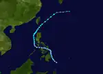 Utor spawned from an area of convection that developed off 907 km (565 mi) south-southeast of Guam on June 26, that remained quasi-stationary for 2 days before upgrading to a tropical depression on July 1 due to favorable conditions such as low vertical shear.[28] The depression strengthen into a tropical storm at 00:00 UTC on July 2.[14][28] Utor tracked west-northwest from a peripheral ridge and developed further, after entering the Philippine Area of Responsibility, and attained severe tropical storm status the following day. Utor was a large cyclone, with gale-force wind of 250 nmi (465 km; 290 mi).[12] Utor reached its peak strength on June 4, with 10-minute winds of 110 km/h (70 mph) and 1-minute winds of 150 km/h (95 mph), with the barometric pressure of 960 hPa (28 inHg).[14][12] Utor was centered 56 km (35 mi) near northern Luzon and tracked northwesterly as it began to weaken.[28] The storm made landfall near the east of Hong Kong on July 5 and quickly weakened before being last noted on July 7 by the JMA.[14]