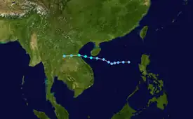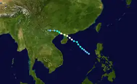 The monsoon trough produced another disturbance that upgraded into a tropical depression to the west of Luzon on June 29. The tropical depression tracked northwestward while a subtropical ridge influenced the depression and caused it to upgrade to Tropical Storm Durian on June 30.[18] The storm attained severe tropical storm status at 18:00 UTC the same day,[14] with 10-minute winds of 110 km/h (70 mph) and 1-minute winds of 140 km/h (85 mph), making it equivalent to Category 1 winds on the Saffir–Simpson scale.[18] Durian had an atmospheric pressure of 970 hPa (29 inHg).[14] Durian made landfall on the Leizhou Peninsula,[14] before rapidly weakening as it continued in the same direction before the JTWC stopped advisories of the storm on July 2,[12] with the JMA doing the same the following day.[14]