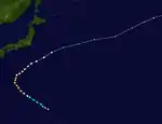 Tropical Depression 09W developed from an area of convection about 1,000 km (620 mi) to the east of Iwo Jima on July 21. Continued consolidation of its convection prompted both the JTWC to classify it as a tropical storm on 18:00 UTC.[28] The JMA followed suit six hours later and named it Kong-rey.[14] By July 23, the JTWC upgraded Kong-rey to a typhoon while the JMA upgraded it to a severe tropical storm.[14][12] A mid-latitude ridge to the east of Japan strengthened, causing Kong-rey to curve and move in a northeastward direction.[28] Kong-rey reached its peak intensity on July 25, then slightly weakened afterwards. At the same time, the JMA had finally upgraded Kong-rey to a typhoon.[14] On July 26, a redevelopment of a small eye caused Kong-rey to reach its second peak intensity for a short period of time. Its peak strength only maxed out to 10-minute sustained winds of 130 km/h (81 mph). Increasing wind shear caused the typhoon to weaken the next day. Kong-rey was downgraded to a tropical storm on 00:00 UTC of July 28.[28] Both agencies issued their final warning later that day when it had become extratropical.[14][12] Its remnants was still tracked until it reached the southwestern Aleutian Islands on August 3.[28]