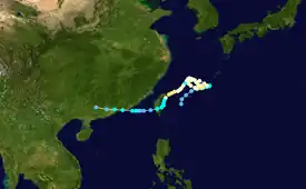 On June 19, an area of convection developed southeast of Yap and by 18:00 UTC, was centered 278 km (173 mi) east-northeast of Palau. Rapid development occurred and the disturbance became identified as Tropical Depression 04W by the JTWC at 21:00 UTC. After entering the PAR and receiving the name Emong by PAGASA, the depression intensified into a tropical storm on June 20.[18] Chebi headed northwest while being located east of the Philippines on June 21 at 06:00 UTC, and would later attain severe tropical storm intensity, before intensifying further to a typhoon the following day.[14] Chebi reached its peak intensity on June 23, before a trough forced Chebi west and northwest where it made landfall near Fuzhou City, China.[18] Chebi rapidly weakened while accelerating northward, and would degrade into an extratropical cyclone on June 24.[14] It's remnants were last noted by the JMA along with other weather centers before dissipating on June 30.[18]
