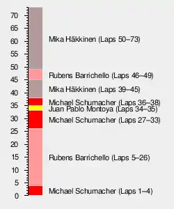 When Schumacher stopped on Lap 39, the McLarens were briefly first and second ahead of Barrichello. Coulthard surrendered second place by pitting on Lap 42 and returned in fourth, while Häkkinen took control of the race by staying out until Lap 46. At Häkkinen's stop, Barrichello led again until his second stop on Lap 50, when Häkkinen took the lead for good, having won the strategy battle with the World Champions.