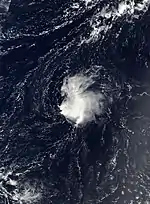 A tropical wave exited the African coast on August 27,[23] and with low favorable conditions the system organized into Tropical Depression Four on August 29 about 630 mi (1,010 km) southwest of Cape Verde.[24] Six hours later, the depression was upgraded to Tropical Storm Dolly after developing sufficient outflow and curved banding features.[25] The storm continued to intensify as more convection developed,[26] and Dolly reached peaked winds of 60 mph (97 km/h) on August 30.[23] After peaking in intensity, the storm suddenly lost organization,[27] and the winds decreased to minimal tropical storm force.[28] After a brief re-intensification trend, Dolly again weakened due to wind shear. On September 4, Dolly weakened to a tropical depression, and later that day was absorbed by the trough; it never affected land.[23]