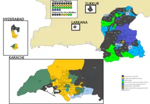 Map of Sindh showing Assembly Constituencies and winning Parties