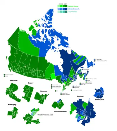 • March 20 - Stephen Harper wins on the first ballot with 56% of points, under the party's weighted voting system.