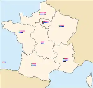 | Outre-Mer (not shown) | French Polynesia, Guadeloupe, French Guiana, Martinique, Mayotte, New Caledonia, Réunion, Saint Pierre and Miquelon, Wallis and Futuna | 3 |